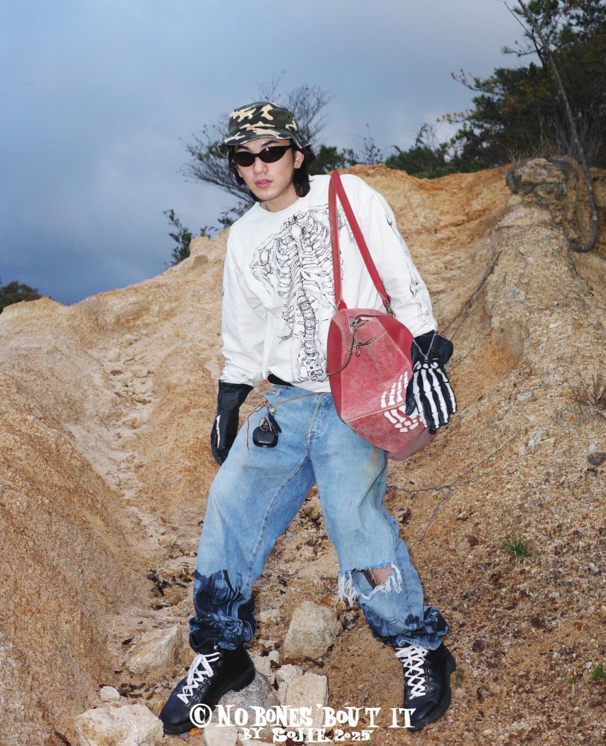 "No bones tee" by sojie 2025 "No bones tee" by sojie 2025 骨に刻まれた感情をそのまま曝け出すと言うコンセプトの”No bones tee”。 見栄ばっかりの世の中で、自分をしっかり持って強く生きていきたいと言うメッセージを込めた。白黒の2色展開。両面特大プリントによって印象的でかつファッション性も兼ね備えた一品に仕上がった。 サイズ展開SーL